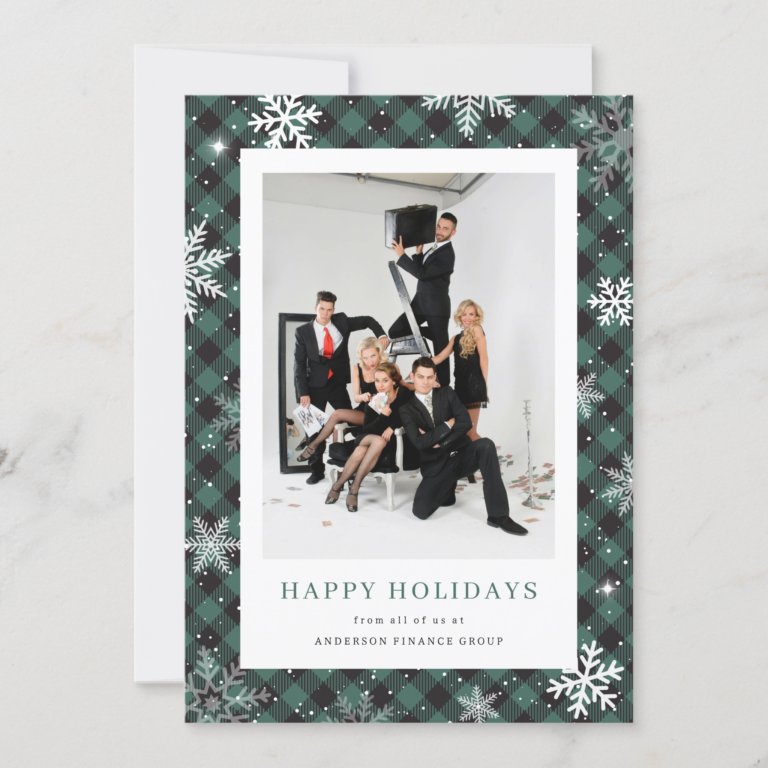 Design a sophisticated green-themed business Christmas card featuring a green buffalo plaid background adorned with elegant white snowflakes to evoke holiday warmth. This design effectively combines festive cheer with professional elegance, making it an ideal holiday greeting that conveys warmth and goodwill while maintaining a polished corporate image, perfect for sharing with clients and partners during the holiday season.